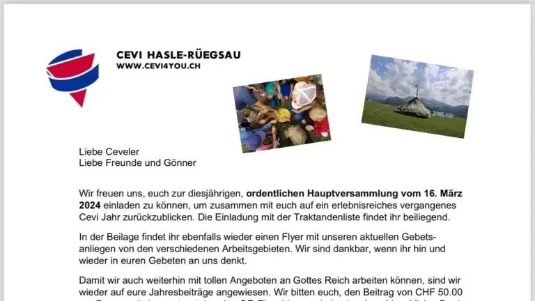 Samstag, 16. März 2024, 20:00 Uhr Ordentliche Hauptversammlung Cevi Hasle-Rüegsau Ort Cevi Budeli zur Agenda Herzliche Einladung zur ordentlichen Hauptversammlung der Cevi Hasle-Rüegsau Mehr dazu in deiner persönlichen Einladung!